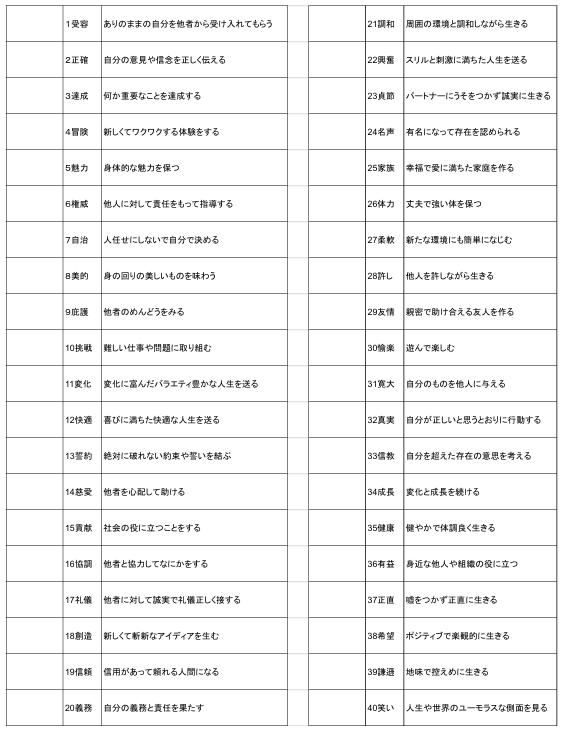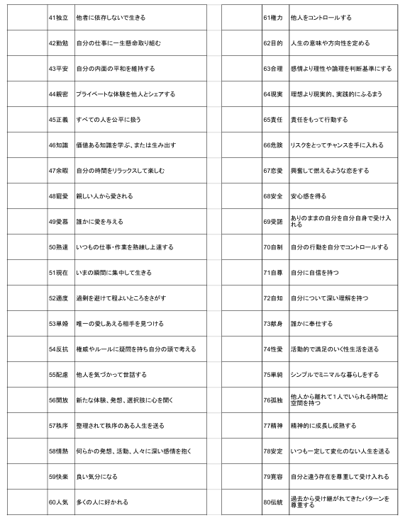 次に、80個の価値観リストを見て、直感で〇△✕を付けます。